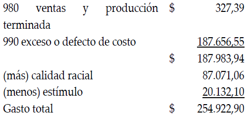 Gasto total: De los gastos por partida se toman los valores de las cuentas 980 Ventas y producción terminada, 990 Exceso o defecto de costo, la calidad racial y el estímulo.