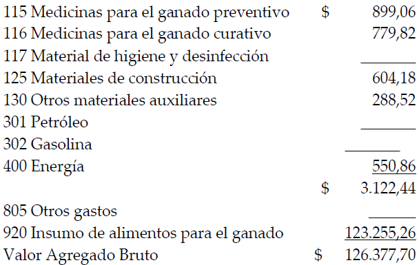 Valor Agregado Bruto: Se toman los gastos directos al proceso productivo, o sea, las partidas 100 - 400, la 805 Otros gastos y la 920 Insumo de alimentos para el ganado.
