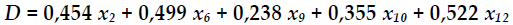 En este proceso cinco variables independientes entraron en la función discriminante, debido a que la variable dependiente es explicada por las independientes que arrojan un mayor valor de F, así también se muestra que los resultados globales son estadísticamente significativos (Mínima D₂ sig.= 0,00 < ,05), de acuerdo con el resultado de Lambda de Wilks (0,984), afiliación (F= 24,216, x₂) cuota de franquicia (F= 18,603, x₆), tamaño de la red (F=4,603, x₉), sector (F=9,640, x10), y sobrevivencia empresarial (F=28,430, x₁₂) comprobando que la función logro discriminar los grupos (1 y 2), quedando fuera del modelo discriminante siete variables independientes. Sin embargo, los resultados estadísticos obtenidos permiten la clasificación en 1. Hombres y 2. Mujeres. Por lo que se obtiene una correlación canónica de 16,1% y se logra integrar el siguiente modelo discriminante: