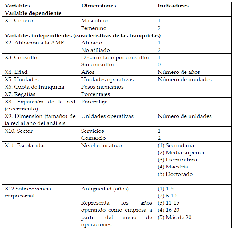 Así pues, se determinaron las diferentes variables que contribuyen en la sobrevivencia empresarial de los franquiciantes mexicanos y su desempeño en cuanto al género, dado que investigaciones previas (Díaz & Jiménez, 2010, Reichborn-Kjennerud & Svare, 2014) han demostrado la amplia capacidad de los hombres, en comparación de las mujeres.