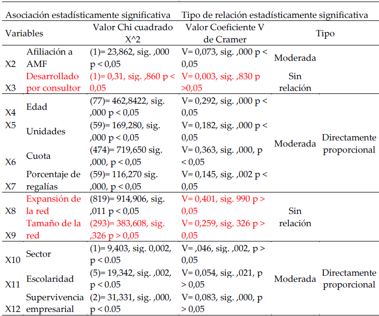 El cuadro 2, muestra los resultados del análisis de correlación, los cuales presentan una asociación estadísticamente significativa entre las variables Afiliación AMF (x₂), Edad (x₄), Unidades (x₅), Cuota (x₆), Porcentaje de regalías (x₇), Sector (x₁₀), Escolaridad (x₁₁) y Sobrevivencia Empresarial (x₁₂), como consecuencia se encontró entre estas variables una relación directamente proporcional positiva en unas y moderada en otras. Excepto en: Desarrollado por un consultor (x₃), Expansión de la red (x₈) y Tamaño de la red (x₉).