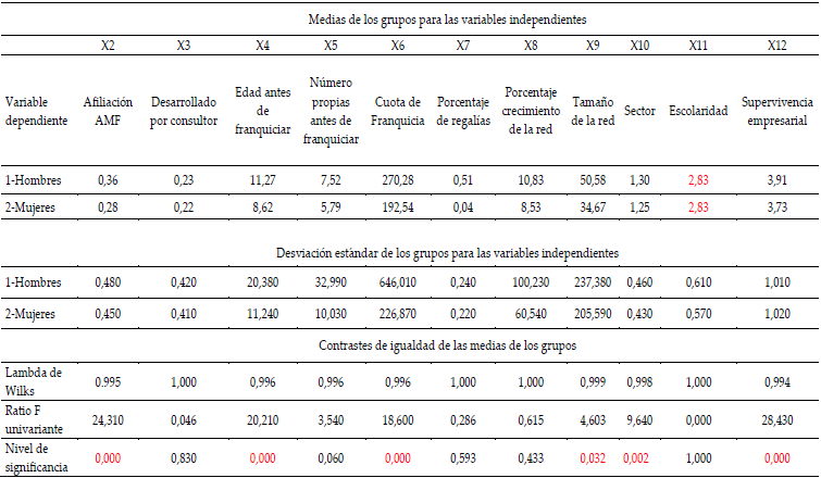 En el cuadro 3, se pueden observar los resultados de la igualdad de medias entre los franquiciantes gestionados por hombres y mujeres en los sectores comercio y servicios, existe diferencia entre los grupos excepto en la variable (x₁₁), (escolaridad). Es decir, los resultados indican que la afiliación a la AMF (x₂), la edad antes de franquiciar (x₄), la cuota de franquicia (x₆), el sector (x₁₀), el tamaño de la red (x₉) y la sobrevivencia empresarial (x₁₂), son significativamente diferentes entre los grupos de hombres y mujeres, dado que el valor de Lambda de Wilks y ANOVA, arrojaron un nivel de significancia de 0,00 (Sig. = ,000 < ,05), por lo tanto es posible comprobar que existen diferencias entre los grupos (1 y 2).