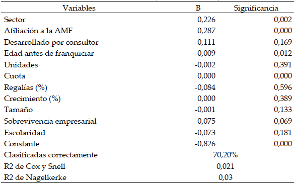 Los resultados de la regresión logística binaria al muestran que las variables sector (B= 0,226; p = 0,002), afiliación a la AMF (B= 0,287; p = 0,000), cuota de franquicia (B= 0,000; p = 0,000), contribuyen significativamente en la gestión de los franquiciantes mujeres y hombres de los sectores servicio y comercio durante el periodo analizado, pero en contraste con el análisis discriminante, las variables tamaño de la red y sobrevivencia empresarial quedaron fuera de la ecuación discriminante (Ver cuadro 4).
