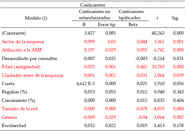 Contrastando las pruebas de hipótesis y mediante el criterio de p valor (Sig.) se puede confirmar que el sector de la empresa, la afiliación a una asociación, la edad y el número de unidades antes de franquiciar, el tamaño de la red y el género del franquiciante (Sig. <0,05) permanecen en el modelo y son relevantes para explicar la sobrevivencia empresarial de los franquiciantes mexicanos.