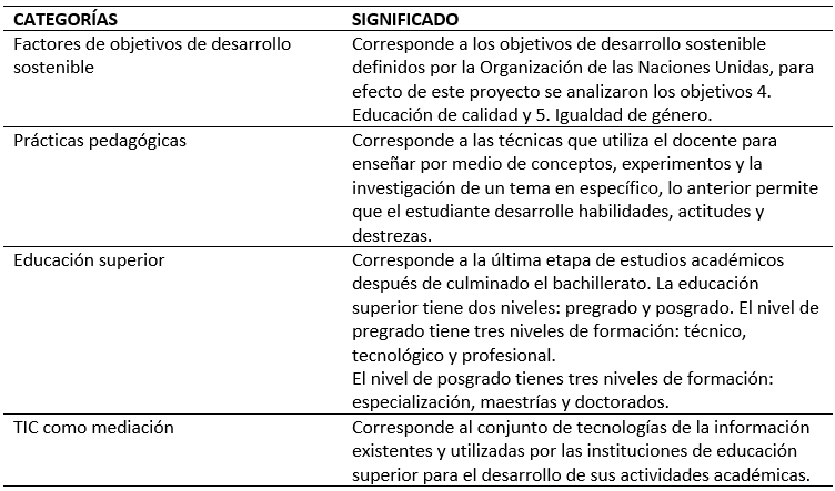 En la investigación participaron cerca de estudiantes de pregrado de diferentes programas académicos en modalidad presencial o virtual de IES del país (235 estudiantes de educación superior distribuidos de la siguiente manera: 175 encuestados y 60 entrevistados). Para analizar e identificar las prácticas pedagógicas en la educación superior mediadas por las TIC para abordar los objetivos de desarrollo sostenible 4 y 5, se plantearon las siguientes categorías:
