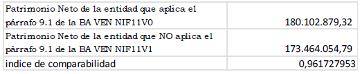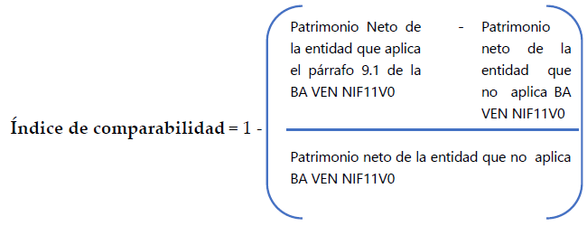 La fórmula que se va a utilizar a los fines de comprender el impacto de la omisión del pasivo por impuesto diferido al utilizar la alternativa dispuesta en el párrafo 9 de la BA VEN NIF 11 V0, se expresa de la siguiente manera el índice de comparabilidad que se va a aplicar:
