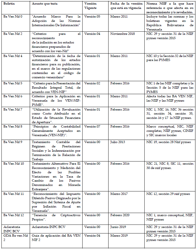 Para abril 2008 se promulga el Boletín de aplicación número cero (BA VEN NIF-0 VERSIÓN 0), para regular el proceso de adopción y aplicación de las normas internacionales de información financiera que serían incorporados como los principios de contabilidad vigentes en la República Bolivariana de Venezuela. Se estableció que la adopción las NIIF emitidas o modificadas por el IASB es previamente analizada, sometidas a un análisis técnico con el fin de determinar el impacto en la dinámica del entorno venezolano y luego auscultadas mediante consulta pública para su aprobación. Desde esta primera versión del BA VEN NIF 0 han salido y se encuentran hasta la fecha vigente los siguientes boletines de aplicación en sus diferentes versiones.