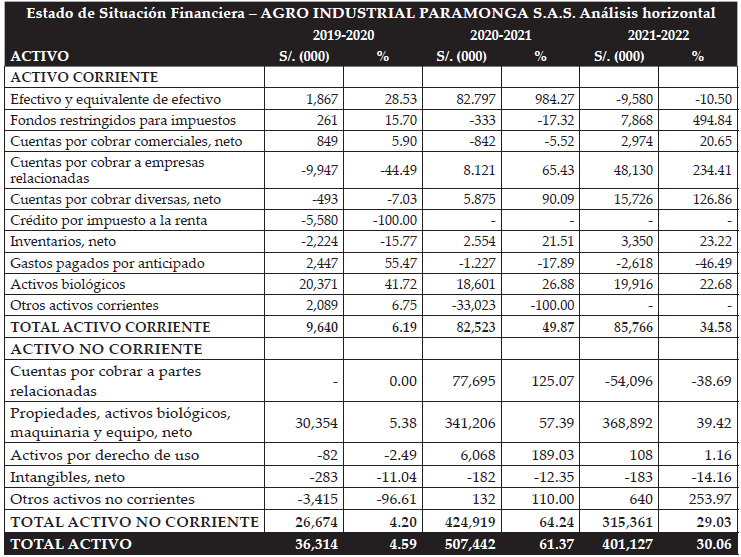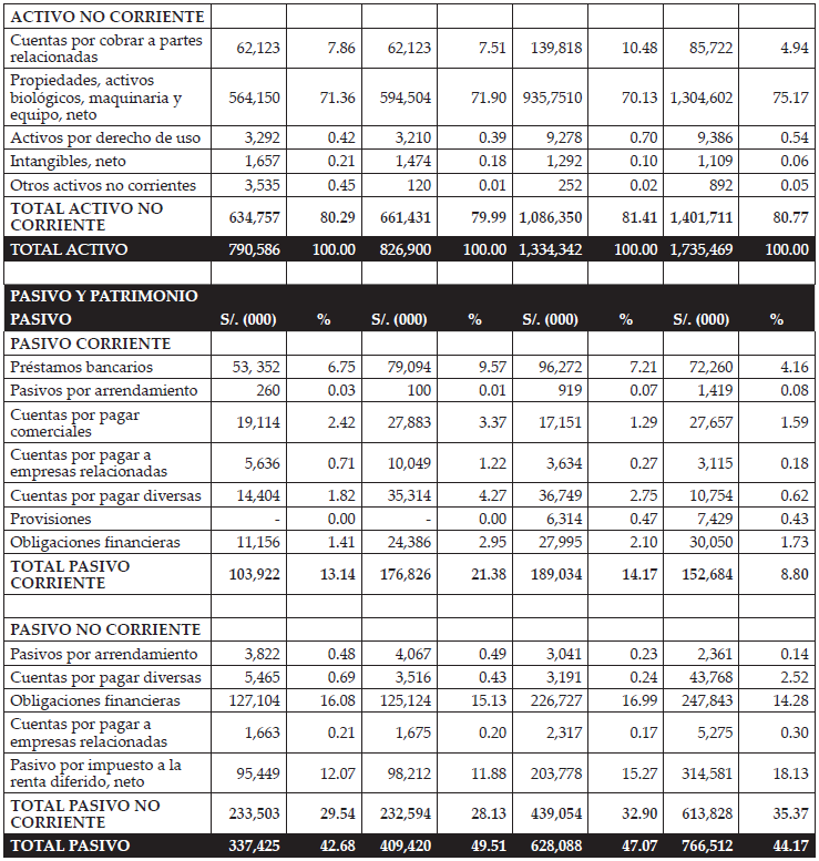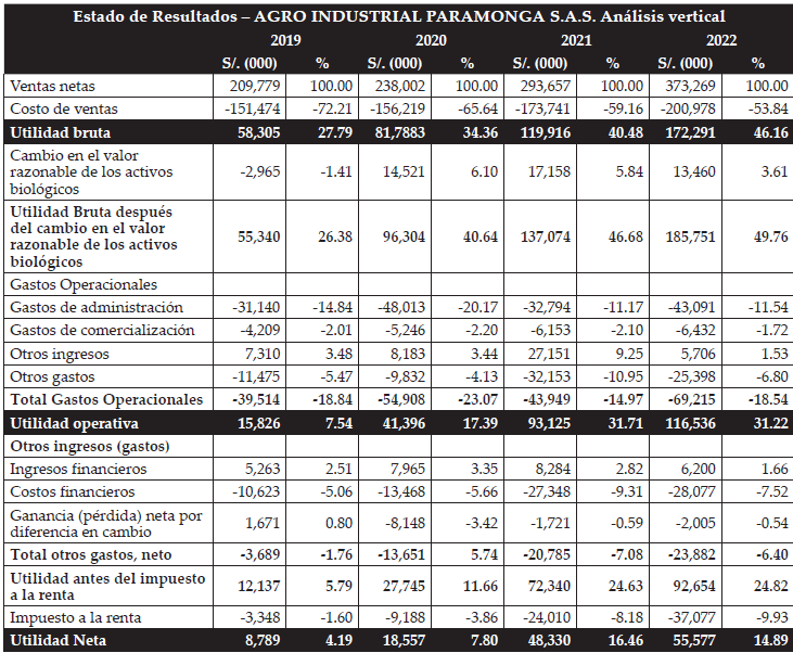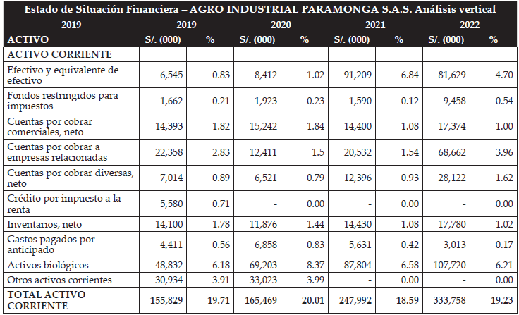 De acuerdo al análisis vertical realizado, las cuentas más relevantes en el estado de situación financiera, en los activos corrientes, fueron activos biológicos, el cual ha ido en incremento a lo largo de los cuatro años. La cuenta de efectivo y equivalente de efectivo no era representativa en los años 2019, 2020, pero hubo un gran incremento en el año 2021, convirtiéndose en 6.84% del total activos de ese año. Por parte del activo no corriente, la cuenta más relevante es propiedades, activos biológicos, maquinaria y equipo neto. Esta cuenta representa poco más de 70% del total activos a lo largo de los cuatro años. En el pasivo corriente, la deuda más representativa, está en la cuenta préstamos bancarios, igualmente en pasivos no corrientes, la deuda más representativa, se encuentra en obligaciones financieras. En el patrimonio, a lo largo de los cuatro años la cuenta más representativa ha sido la del capital social, el monto ha sido constante, la causa de su disminución en % es debido a la cuenta excedente de revaluación. Por otro lado, en el estado de resultados, la cuenta que más representa, con más de 50% es el costo de ventas.