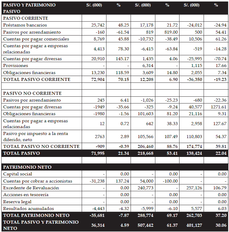 Continuando con el análisis horizontal, lo que más resalta, es el incremento de 984.27% de la cuenta efectivo y equivalente de efectivo que en el 2020 era 8,412 y en el 2021 el monto fue 91,209. También se ha registrado un incremento considerado en las cuentas por cobrar a empresas relacionadas en el 2021 era 20,352 y en el 2022 pasó a 68,662. En el pasivo no corriente, las cuentas por pagar diversas en el año 2021 eran de 3,191 y en el 2022 fue de 43,768.