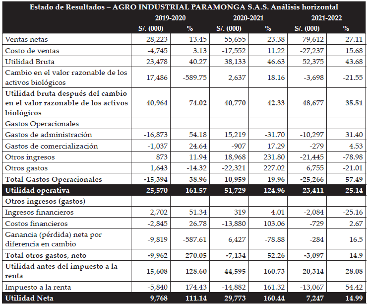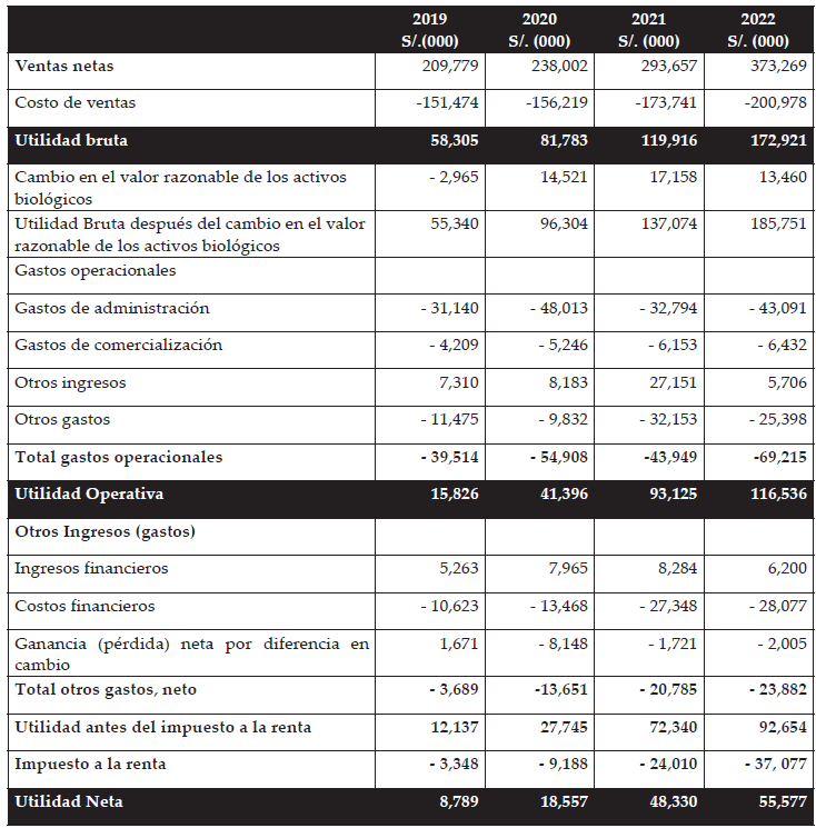 Por otro lado, en el estado de resultados, hubo un aumento considerable en cambio en el valor razonable de los activos biológicos. En el año 2022, ha habido un aumento en los gastos operacionales, frente a los años anteriores. Finalmente se ha tenido resultados positivos en la utilidad neta que ha ido aumentando, se ve un mayor crecimiento en el 2021, pues la utilidad neta fue de 48,830 y en el 2020 era 18,557.
