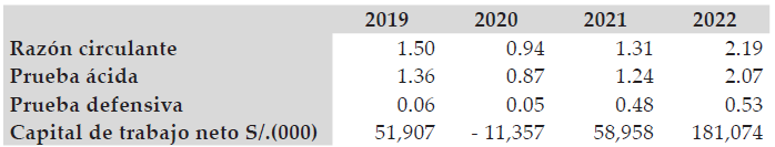 El ratio circulante mide la capacidad de una empresa para cumplir y pagar obligaciones a corto plazo (Céspedes y Rivera 2019). En este caso, la empresa recibió 1,5 soles y 0,94 soles de capital de trabajo a tasas vigentes para el pago de deuda de corto plazo por sol en 2019 y 2020, respectivamente, los cuales disminuyeron 0,56 soles en esos años. Por otro lado, en 2021 y 2022 la empresa creció 0.87 soles con 1.31 soles a 2.19 soles. 2022 es la mejor fecha debido al aumento de la financiación debido a impuestos y cuentas por cobrar relacionadas (Minagri, 2022).