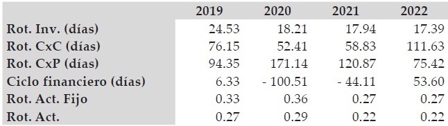 Para el periodo promedio de cobranzas en días, se ve una mejora entre el 2019 al 2020, pasando de 76.15 a 52.41 días. Este cambio se debió a la política de cobranzas para las empresas relacionadas que se redujeron en un 55%. Para el 2021 empezaron a subir los días promedio a 58.83 días ya que las cuentas volvían a su ritmo regular. Pero en el 2022 la misma cuenta de cuentas por cobrar a empresas relacionadas se triplico, por lo que el promedio de días para cobrar se volvió en 111.63 días. Los plazos de pago a proveedores en días fueron de 94.35 en el 2019. Para el 2020 la cuenta subió a 171.14 días, esto se generó por lo que las cuentas por pagar se duplicaron y el costo seguía su tendencia regular. Para el 2021 bajó 51 días por la regulación de las cuentas. Volviendo a retomar el ritmo en 2022 con 75.42 días, un índice incluso menor que el del año 2019.
