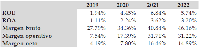 Las utilidades son importantes para toda empresa, y son un factor a tomarse en cuenta para atraer capital externo (Santiesteban et. al, 2020). Con, respecto a los ratios de rentabilidad, el ROE de la empresa ha aumentado considerablemente luego del año 2019. Dado que el ROE mide el retorno de la Utilidad neta hacia los accionistas, un aumento en este ratio significa una mayor percepción de los beneficios de la empresa para sus dueños.