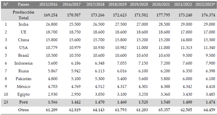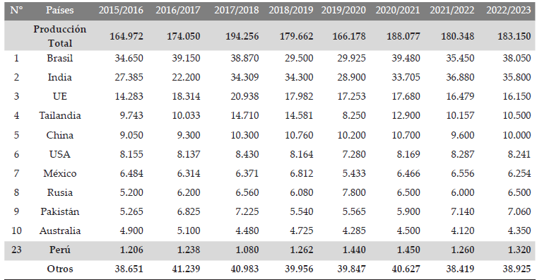 De acuerdo con el último informe del USDA que fue publicado el 22 de noviembre del 2022, la producción mundial de azúcar para el periodo 2022/2023 se estimó en 183,1 millones de toneladas, con un aumento de 1.6% (2.8 millones de toneladas más) respecto a la campaña del periodo 2021/2022 (USDA, 2022), el cual estaría siendo sustentada por la mayor producción de Brasil (+7.3%) estimando un repunte de 4.6 millones de toneladas, lo cual se espera que compense el descenso de producción en Rusia. En otras palabras, Brasil estaría acumulando un volumen de 38.1 millones de toneladas, debido a que se espera que el clima favorable y un mayor rendimiento de la caña de azúcar permita disponer de un mayor volumen para moler (USDA, 2022). Además, se espera que la mezcla de producción azúcar/etanol se mantenga igual que la temporada pasada, siendo este de 45% azúcar y 55% etanol; sin embargo, se proyecta que las exportaciones aumenten junto a una mayor exportación de suministros. (USDA, 2022)
