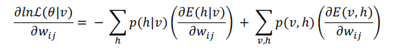 Para el desarrollo de este método de aprendizaje, se tiene en cuenta las ecuaciones que manejan Fischer e Igel (2014). El entrenamiento no supervisado busca actualizar de forma progresiva los pesos (w’ij, wij) (Plahl, Sainath y Ramabhad, 2012), encargados de unir la capa visible (vi) con la capa oculta (hj), mediante la ecuación (1), haciendo uso de la distribución probabilística de la capa oculta a la capa visible (p(h|v)), la distribución probabilística de la capa visible a la capa oculta (p(v|h)) en la ecuación (2) y la función de energía (E) entre las mismas, manejando la ecuación (8).
