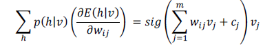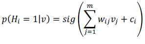 (4)Que de forma simplificada, la probabilidad condicional i=1 de la capa oculta en una (p(Hi=1|v)) en la ecuación (5), se hace con la función de activación sigmoide (sig) de las ecuaciones (6) y (7).