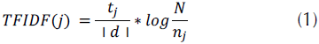 El TF-IDF es una medida numérica que expresa que tan relevante es un término (palabra) para un documento con relación a un conjunto de documentos. Esta medida se utiliza a menudo como un factor de ponderación en la recuperación de información y en la minería de texto. Los términos con más alto TF-IDF son, por lo general, aquellos que mejor caracterizan la temática de un documento. Se calcula mediante la ecuación (1).
