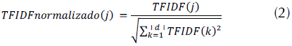 El TF-IDF se suele normalizar, ya que el uso de esta frecuencia de los términos puede conducir a problemas como keyword spamming, es decir, la repetición de un término en un documento con el propósito de mejorar su clasificación en un sistema de recuperación de información o la generación de un sesgo hacia los documentos largos, haciendo que se vean más importantes de lo que son debido a la alta frecuencia del termino en el documento. Para normalizarlo, se obtiene el TF-IDF para cada termino j del documento d, se suman los cuadrados de estos y se obtiene la raíz cuadrada de dicha sumatoria (ecuación (2)). El resultado pasa a dividir el TF-IDF del término j y ese será su TF-IDF normalizado. Para el ejemplo, la sumatoria fue 0,0808 y la raíz = 0,2844. Los resultados para cinco términos de la canción se muestran en la tabla 1.