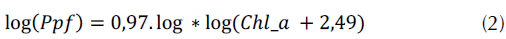 A partir de la relaciónentre la concentración de clorofila_a y la producciónprimaria fitoplantónica (calculada como mgC/m3/año), se calculó la producción primariafitoplantónica y de acuerdo con Bouliony Hakanson (2003) en la ecuación (1) se trabajaron lossiguientes algoritmos: