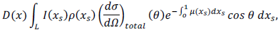 (9)Donde L es la distancia de la fuente hasta el objeto, θ es el ángulo de dispersión que está dado por θ = cos -1 (x- xs) v/ ‖x - xs‖, v es la dirección del rayo y p (xs) es la densidad del electrón en la posición xs. Por tanto, la energía de dispersión total, Edt, adquirida por un detector puede ser formulada a partir de la ecuación (10).