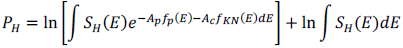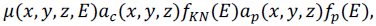 (11)Donde (x, y, z) son las coordenadas de la muestra, μ (x, y, z, E) es la atenuación total, E es la energía incidente, ac (x, y, z) es el coeficiente de Compton, ap (x, y, z) es el coeficiente fotoeléctrico, fKN (E) es el diferencial de dispersión de Compton o dispersión incoherente y fp (E) se aproxima a la dependencia de energía de la interacción fotoeléctrica (ecuación (12)).