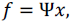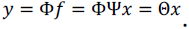 (16)Donde x es la secuencia de coeficientes de f y la base Ψ es una matriz con columnas ϕ1,…,ϕG . Claramente, f y x son representaciones equivalentes de la misma señal, f es una combinación lineal de apenas F vectores base, con F << G (Shannon, 1998), (Wakin, 2008). De acuerdo con las ecuaciones (15) y (16) se obtiene la ecuación (17).