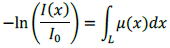 Considerando un rayo de intensidad Io, que atraviesa el objeto con una distribución no homogénea de atenuaciones μ(x) , la intensidad del rayo I(x) medida por el detector D depende tanto de la distancia atravesada x , como de la atenuación μ(x) de cada punto en su trayectoria. Esto puede modelarse con la ecuación (1).