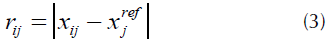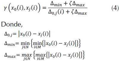En GRA primero se genera el vector de referencia Xo, de la matriz X, a través de la escogencia de los valores mínimos para los costos y los valores máximos para los criterios de beneficios. Después, la secuencia de datos debe ser normalizada para X de acuerdo con tres situaciones: más grande el mejor, más pequeño el mejor o nominal el mejor. Luego, se calcula el coeficiente relacional de Grey como lo describe la ecuación 4 (Hernández et al., 2015).