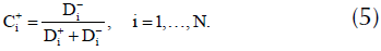 El procedimiento del algoritmo Topsis se describe en Hernández, Giral y Páez (2015a); Ramírez y Ramos (2010, 2013). Inicialmente se construye la matriz de decisión X y se normaliza usando el método de raíz cuadrada, luego se determina la solución ideal y la peor solución. Después, para cada alternativa se calcula la distancia euclidiana D, y por último, las alternativas son organizadas en orden descendente de acuerdo con el índice de preferencia dado por la ecuación 5.