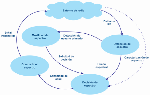 Con el objetivo de lograr un uso más eficiente del espectro, la tecnología de radio cognitiva (CR) propone realizar una asignación dinámica del espectro (DSA). Esto consiste en que usuarios no licenciados, también denominados usuarios secundarios (SU) o usuarios de radio cognitiva, recurran a las SO en bandas de frecuencia licenciadas, la cuales son asignadas a usuarios licenciados, también denominados usuarios primarios (PU), sin interrumpir ningún proceso de estos últimos en dichas bandas. Para lograr lo anterior, la CR interactúa de forma dinámica con el entorno y realiza la modificación de los parámetros de funcionamiento necesarios, con el objetivo de aprovechar oportunamente el espectro no utilizado sin interferir con los PU (Haykin, 2005; Mitola y Maguire, 1999).
