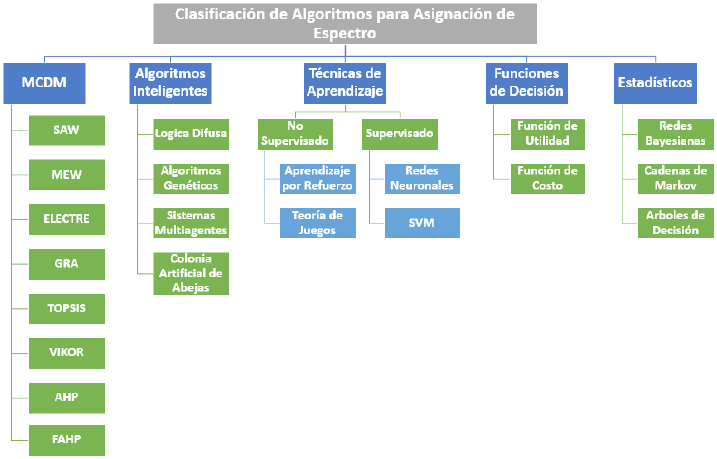 los algoritmos de asignación de espectro más relevantes y su clasificación de