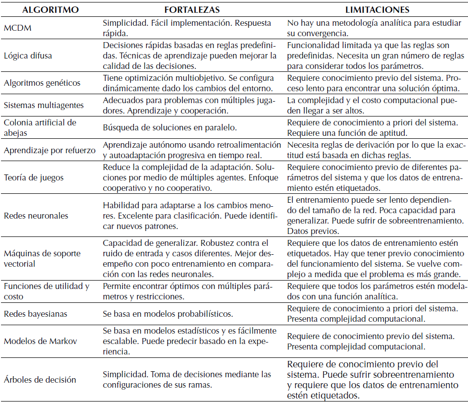 Redes neuronales: Las redes neuronales se asemejan al cerebro en dos aspectos (Haykin, 1998): 1) el conocimiento es adquirido por la red de su entorno a través de un proceso de aprendizaje, y 2) las fuerzas de conexión interneuronas, conocidas como pesos sinápticos, se utilizan para almacenar el conocimiento adquirido. Algunas de las capacidades y ventajas de las redes neuronales incluyen el modelado de comportamientos no lineales y la capacidad de adaptación ante cambios pequeños, y su principal desventaja es la necesidad de realizar un entrenamiento bajo diferentes condiciones del entorno (Bkassiny, Li y Jayaweera, 2013).