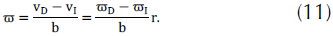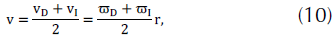 Asumiendo para el modelo de tracción diferencial, que ωI y ωD son las velocidades correspondientes de las ruedas izquierda y derecha, dado el radio de las ruedas como r, las correspondientes velocidades lineal y angular están dadas por las ecuaciones 10 y 11 respectivamente