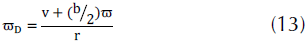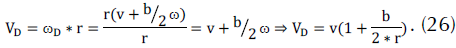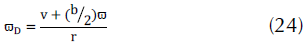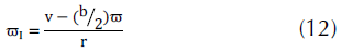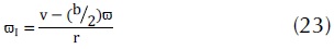 Donde b es la separacion entre las dos ruedas del vehículo. También si las velocidades lineal y angular son dadas, entonces la velocidad angular puede ser obtenida por las ecuaciones 12 y 13:
