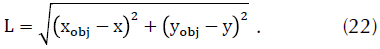 Donde el signo viene dado por el sentido de giro necesario para alcanzar el punto objetivo en la figura 7, L es la distancia a la que se encuentra el punto objetivo y Δx es el desplazamiento lateral.