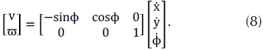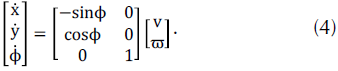 La ecuación 2 se presenta en forma matricial por la ecuación 3, donde v es la velocidad lineal del vehículo y ω es la velocidad angular, estas ecuaciones pueden ser también escritas en la forma de (1) como