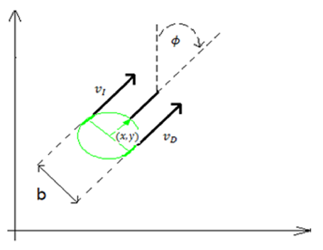 velocidades independientes (VI y VD, respectivamente), que se mueven en el plano 2D hacia un punto específico (x, y) y una orientación ϕ específica.