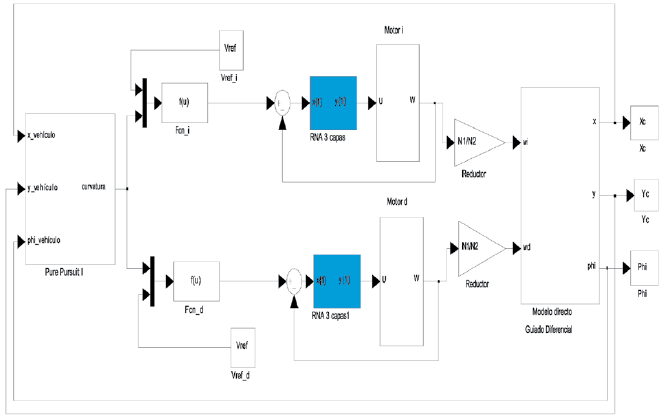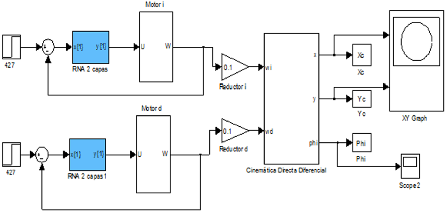 Para probar el funcionamiento del esquema de la figura 2 se integraron en un bloque de SimuLink los siguientes elementos: dos modelos de los motores con sus respectivos controles de velocidad manejados por redes neuronales artificiales (RNA), dos bloques reductores de velocidad y el bloque cinemática directa diferencial; a dicho esquema se le aplicaron diferentes señales de control en las entradas de referencia, tal como se muestra en la figura 3.