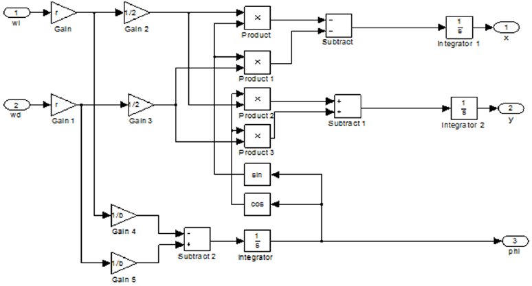 El siguiente paso es representar las ecuaciones del modelo cinemático (15) en un diagrama de bloques del SimuLink, el cual permite calcular la posición del robot móvil en cada instante de tiempo. Este bloque se llama cinemática directa diferencial y servirá para probar el control de posición, el cual será diseñado posteriormente. El bloque cinemática directa diferencial se muestra en la figura 2.