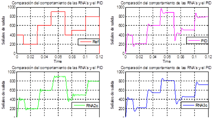 En este artículo se ha comprobado que las redes neuronales pueden emular el comportamiento de un controlador PID para controlar los perfiles de velocidad de los motores de tracción un robot móvil tipo diferencial. La configuración de la red neuronal es un punto fundamental para que una aplicación produzca buenos resultados. Si los datos de entrenamiento son correctos, pero la arquitectura de la red no es la adecuada para la aplicación, la red neuronal no se comportará como se espera. Inicialmente se obtuvo un modelo en forma de función de transferencia de todas las partes eléctricas y mecánicas del modelo físico que eran necesarias para la construcción del robot móvil de tracción diferencial. En este modelo no se tuvieron en cuenta las no linealidades del modelo y se consideró el motor libre de carga. Para el diseño del controlador de velocidad se estudiaron diferentes técnicas de control, pero al final se optó por reemplazar un PID sintonizado con la herramienta sisotool por una RNA. Después de tener sintonizado el controlador de velocidad PID se desarrollaron varias arquitecturas de RNA con un tipo de redes de retropropagación (back-propagation), entrenadas con los datos obtenidos del controlador PID. En la figura 4 se muestra la comparación entre estas dos estrategias de control.