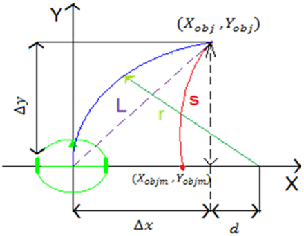 En la figura 7 puede verse también que la curvatura de la persecución pura es la inversa del radio de una de las circunferencias que pasa por la posición actual del vehículo y por el punto objetivo.