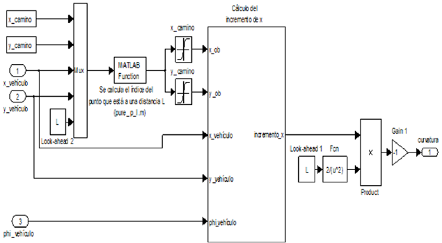 Este bloque es llamado persecución pura I y consta de una MATLAB Function con nombre pure_ p_I que es la encargada de calcular el índice de los valores x_camino y y_camino más próximos a la posición del robot y un sub-bloque denominado cálculo de incremento de x que es la representación de la función 21. Este bloque fue tomado del toolbox Hemero y entrega a su salida el valor de la función 20 que es la curvatura entregada al robot móvil (Vachhani, Mahindrakar y Sridharan, 2011).