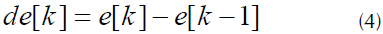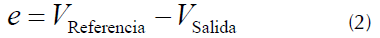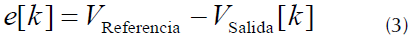 El error que se desea estimar es el error relativo, donde la referencia es el punto de control calculado con los parámetros del ciclo útil ajustados (Elmas, Deperlioglu y Sayan, 2009). La ecuación 2 muestra cómo se calcula en error para un sistema continuo. Debido a la discretización de la simulación en MATLAB, la ecuación 3 muestra el modo de calcular el error. En la ecuación 4 se observa también cómo se calcula la derivada del error por unidad de tiempo de simulación.