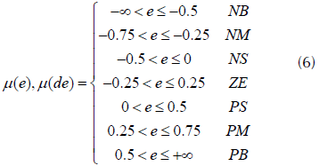 Ya que las variables lingüísticas fueron declaradas según intervalos numéricos, donde el error y la derivada del error pueden encontrarse (Elmas, Deperlioglu y Sayan, 2009), la ecuación 6 contiene los intervalos que se consideran las variables lingüísticas.