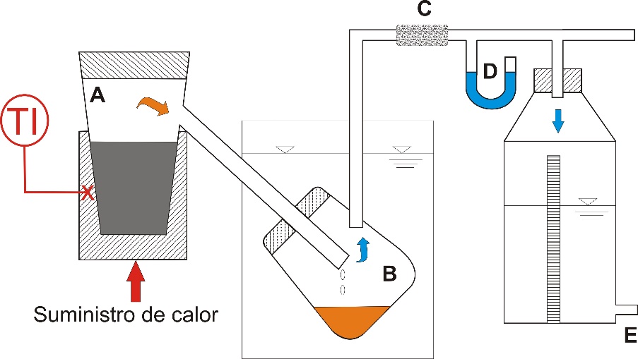 En este montaje se llevan a cabo las pruebas experimentales cuyas condiciones corresponden a las pruebas 1 y 3 de la Tabla 1. El material a procesar se ubica en la retorta metálica (A). El calentamiento se realiza por medio de un mechero Bunsen de acuerdo al perfil establecido. Los productos volátiles y gaseosos generados pasan a un Erlenmeyer (B) que se encuentra sumergido en un baño de agua con hielo causando la condensación de los alquitranes y el agua generados. Luego el gas es conducido por un filtro (C) y es recogido en un depósito de vidrio con agua a un nivel graduado (E). La recolección se logra regulando la presión observada en un tubo en U (D), en el interior del depósito, mediante la evacuación coordinada de agua. Después de terminar el proceso se deja enfriar el sistema hasta temperatura ambiente y se determinan la masa de carbonizado residual, la masa del residuo líquido en el Erlenmeyer, la masa de las secciones de vidrio posteriores a este último para determinar el alquitrán adherido en las paredes y el volumen final desplazado de gas. Para calcular el volumen real de gas se utiliza un factor de corrección adicionado a la lectura en el depósito de almacenamiento de vidrio. Este factor corresponde al cambio en el volumen de material sólido en la retorta, sumado al volumen de condensado, teniendo en cuenta la temperatura alcanzada durante la operación.