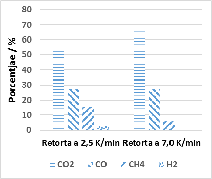 La influencia de la tasa de calentamiento en la fracción final de productos puede observarse al comparar los resultados de las Pruebas 1 y 3 en las Figuras 5(a) y 5(b) donde la producción de alquitranes varía de 26 % a 2,5 K/min a 38 % a 7 K/min.