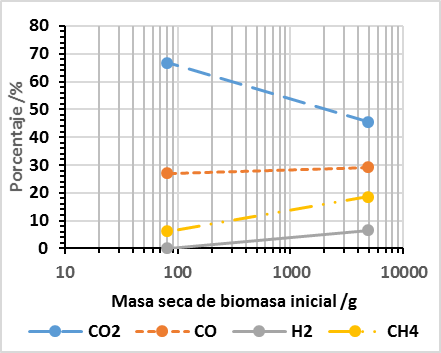 Al aumentar el tamaño del reactor aumenta la influencia de las reacciones secundarias de recondensación y craqueo de alquitranes que causan un aumento en el rendimiento de carbonizado y de gas, con una consecuente disminución del rendimiento de los productos líquidos. El craqueo de alquitranes provoca adicionalmente que parte de la energía de los alquitranes se transfiera al gas y por lo tanto que el poder calorífico del gas aumente. El poder calorífico del carbonizado no varía apreciablemente al modificar las condiciones del reactor. Al aumentar la tasa de calentamiento se favorece el rompimiento de cadenas en la biomasa que ocasiona el aumento en la producción de gases y líquidos. Por lo tanto disminuye la producción de carbonizado.