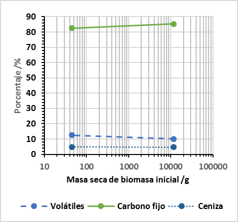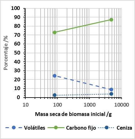 Se determina una alta influencia del tamaño del reactor y la tasa de calentamiento en los rendimientos másicos y las características fisicoquímicas de los productos de la carbonización.