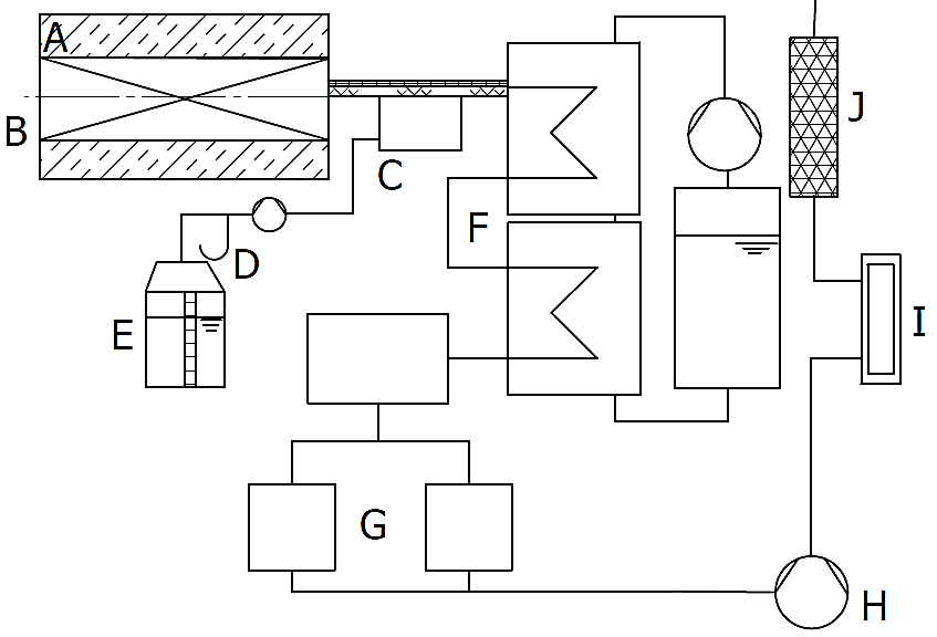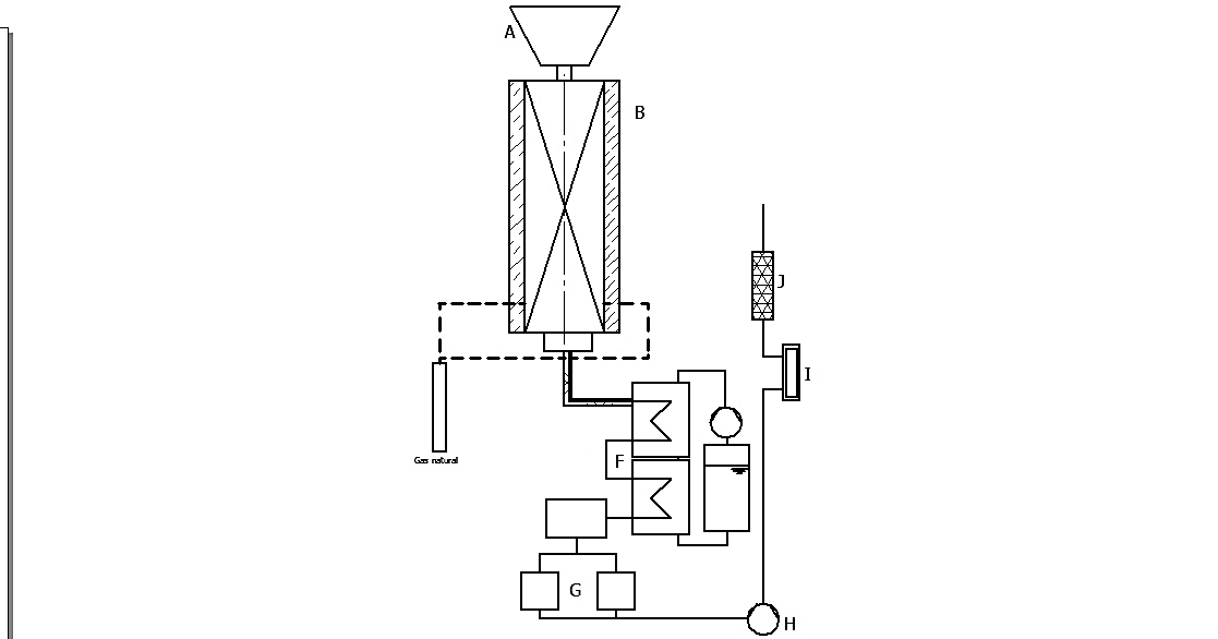 A medida que se calienta la muestra los productos volátiles y gaseosos salen del reactor (B) succionados por una bomba de vacío (H). Entre el reactor y la bomba de vacío se ubican dos intercambiadores de calor de tubos concéntricos (F) en donde se condensan los alquitranes y el agua y dos filtros de aserrín (G) donde se separan los alquitranes que permanecen en el gas después de la condensación. Después de la bomba los gases son medidos por medio de un contador de gas (I). Por último, la mezcla de gases es quemada y dirigida hacia una chimenea (J). Finalmente se deja enfriar el equipo a temperatura ambiente y se determina la masa de carbonizado residual, la masa de residuo líquido condensado de los intercambiadores y las secciones de manguera posteriores a estos para determinar el alquitrán adherido en las paredes. En este montaje experimental se realiza la evacuación continua del gas producido por lo que no es posible recolectar una muestra de la cantidad total de gas producida que permita determinar su composición final.
