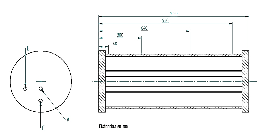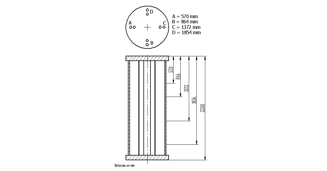 El montaje experimental se representa en la Figura 2 (a). En este montaje se lleva a cabo la Prueba 2, cuyas condiciones operacionales se observan en la Tabla 1. El reactor es alimentado por una tolva que contiene el material a procesar (A). Como la operación se realiza en lotes, se alimenta la biomasa, luego se retira el sistema de alimentación y se sella el equipo. El lecho es cilíndrico con una longitud de 99,5 cm y un diámetro de 16 cm. Para el calentamiento, se emplean dos quemadores a gas marca Joannes Finterm modelo JM 3 de 11,9 a 37,7 kW de potencia en extremos opuestos del equipo. Se ubican termopares a 57, 86, 137 y 185 cm de la tapa superior. En cada posición axial se ubican dos termopares: uno junto a la pared del reactor y el otro a la mitad del radio del mismo, de acuerdo a la Figura 3 (b). El perfil de temperaturas se registra mediante una tarjeta de adquisición de datos Agilent 34970A. La temperatura media del reactor de lecho fijo vertical corresponde al promedio entre las medidas tomadas de los termoelementos B y los termoelementos C ya que son estos los que miden la temperatura de la muestra.